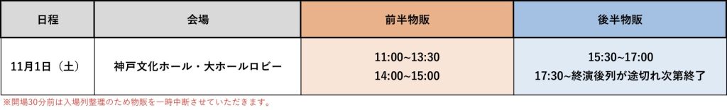 ※11/1(土)神戸公演と11/8(土)幕張公演の『二部』開演中(開演から1時間程度)はチケットフリー販売(チケット保有の有無に関わらずどなたでもご購入可能)ですが、物販入口にてANGEL EYES会員証の提示を確認させていただきます。