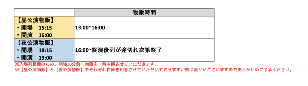 ※各公演、開場30分前に準備のため一旦物販を閉めさせていただきます。