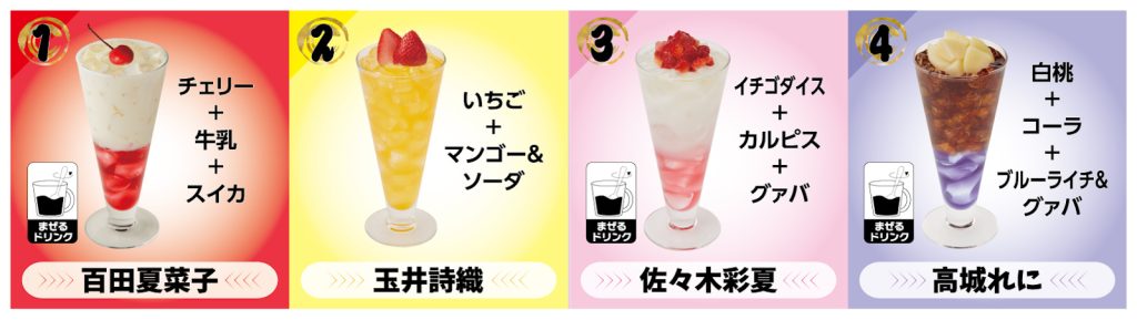 コラボドリンクは、「ももいろクローバーZ」のメンバーをイメージした4種【各750円(税込)】をご用意します。
