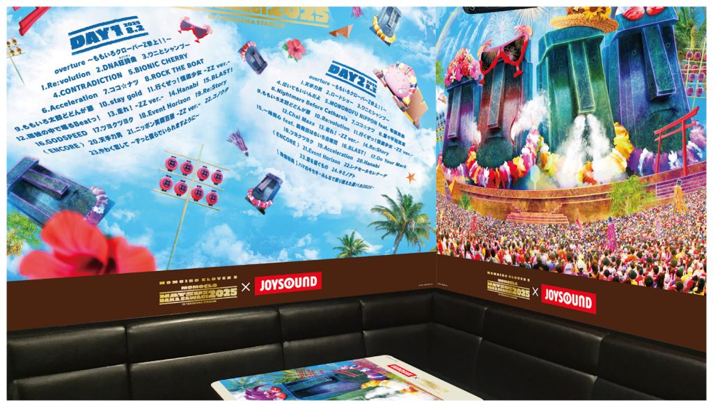 カラオケコラボルームは、ルーム内の壁面やテーブル、ドアに至るまで、「ももクロ夏のバカ騒ぎ2025」の世界観で彩られ、ファンには堪らない空間を演出に!さらに、本コラボルームには、臨場感あふれるDolby Atmos音声でライブ映像が観られるモニターやスピーカーが設置され、『ハマの夜祭り番長襲名記念ももクロ夏のバカ騒ぎ2025 in 横浜スタジアム』LIVE Blu-rayよりDAY2公演の選りすぐったダイジェスト映像がその場で観られるようになっています。まるでライブ会場にいるかのような臨場感や没入感をぜひ味わってください♪