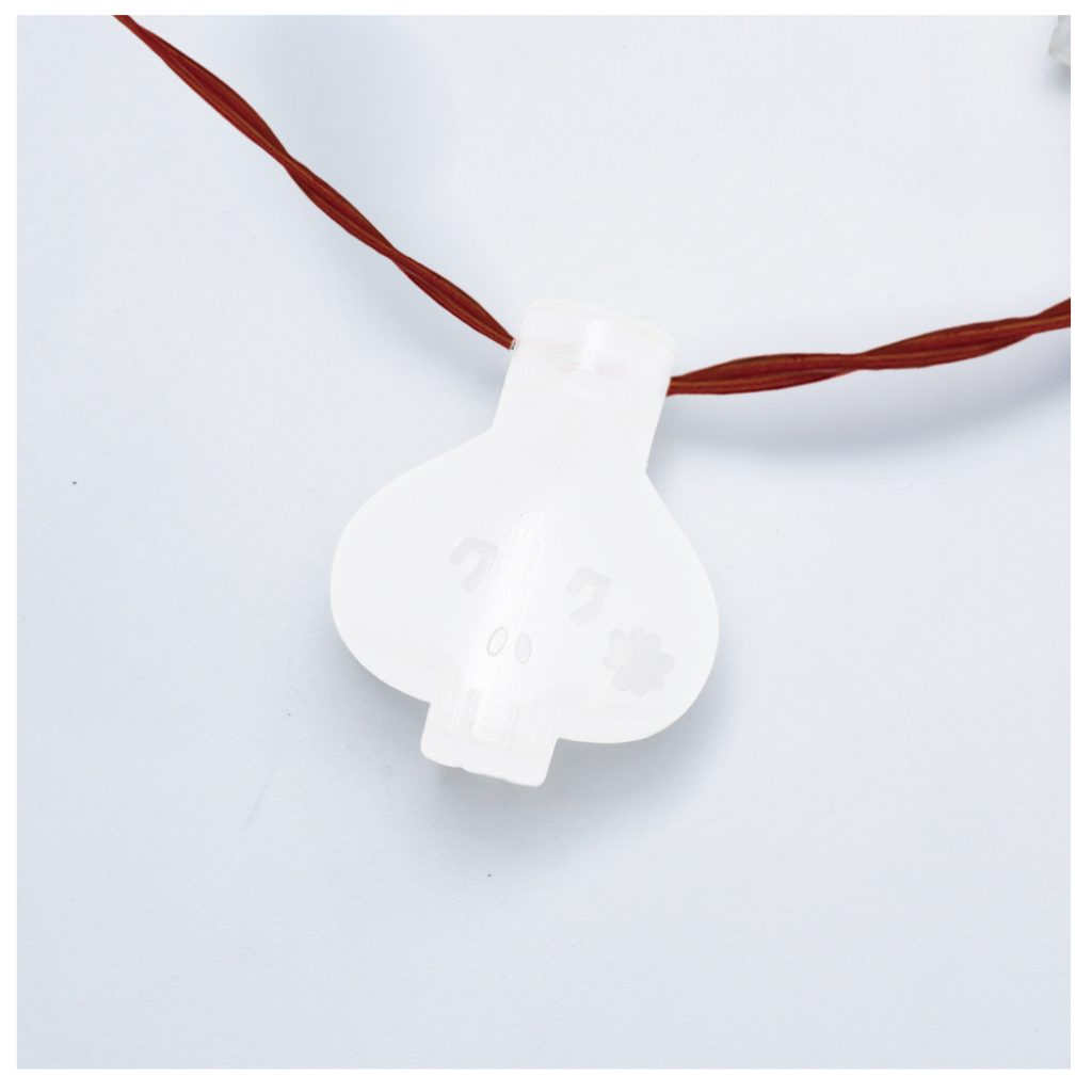 「東京ももクロランド」にまつられている偶像にかかっている、ももたんスカルを首にかけて使用する光るネックレスにしました。ももたんスカル1個1個が常灯と点滅で光ります。発光色はホワイト。